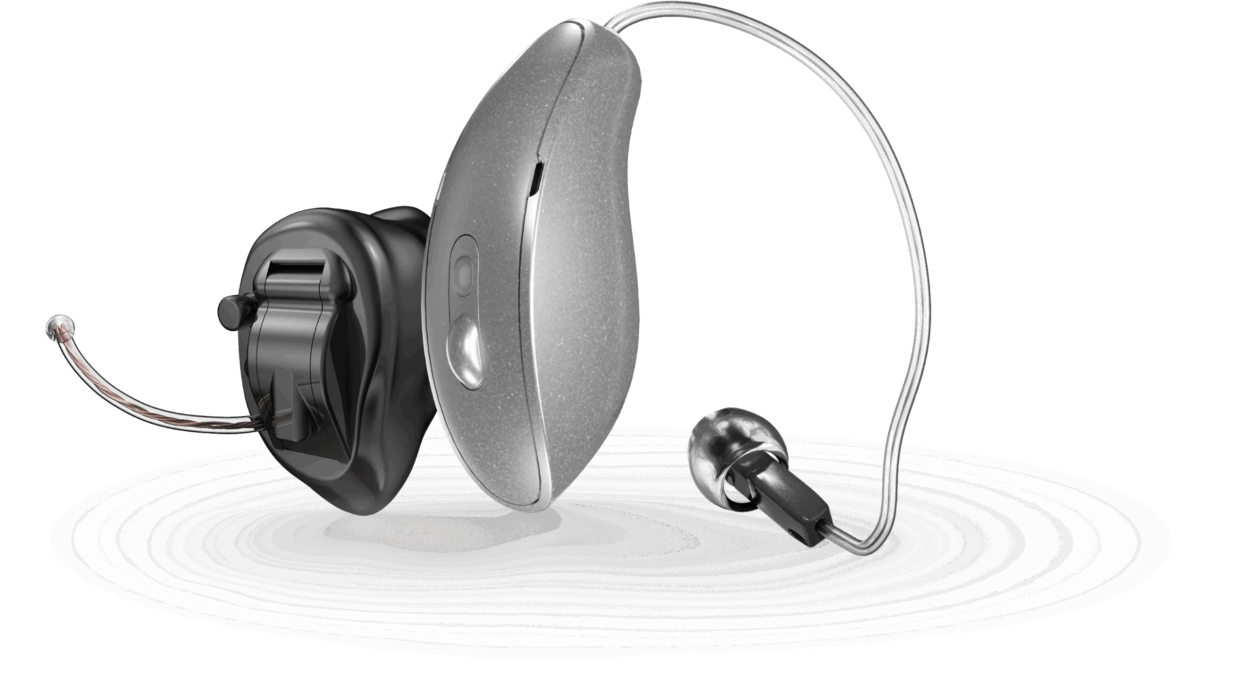 We typically recommend either a CROS or a BiCROS system. A CROS system consists of a single microphone and single receiver contained in two individual devices (one for each ear). The ear with little-to-no functional hearing is fit with the microphone-equipped device, and the ear with normal hearing is fit with the receiver-equipped device. Sound arriving at the ear with hearing loss will then transmit through a wireless connection to the receiver-equipped device on the normal-hearing ear — to help you hear sounds regardless of which side they’re coming from.